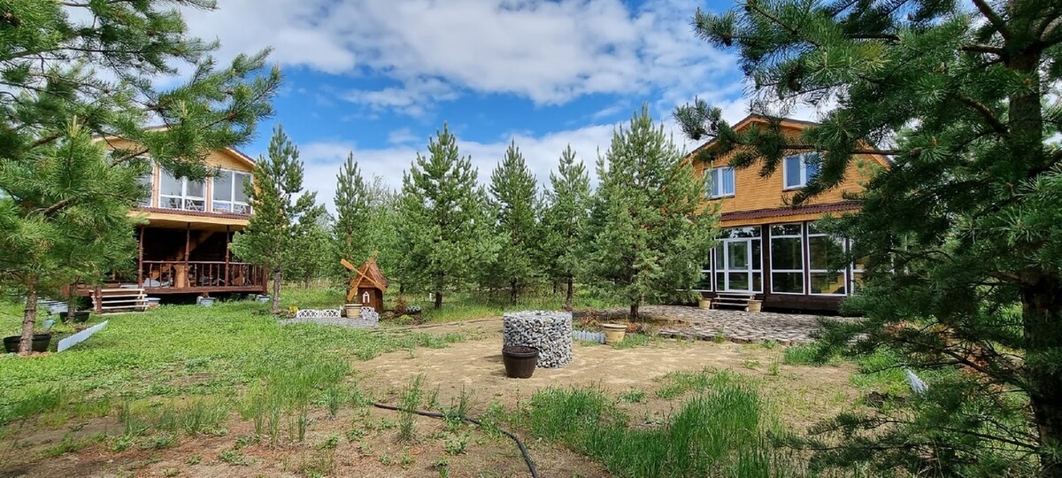 Это хвойный лес вблизи озера Большие Аллаки. На нашей территории располагаются 3 больших дома: